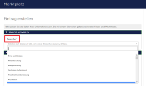 - Suche Dir jetzt eine Branche aus, indem Du auf „Klicke auf dieses Feld, um eine Branche auszuwählen“ gehst.